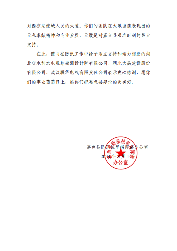 信中指出,入梅以来,因持续强降雨,西凉湖流域受灾严重,外江超警戒水位,西凉湖超保证水位,西凉湖流域防汛形势十分严峻。作为嘉鱼县余码头泵站更新改造工程的参建单位,大禹公司积极响应湖北省委、咸宁市委关于积极参与防汛抗旱的部署要求,充分发挥企业技术优势、资源优势,为防汛工作提供了极大的支持。在防汛期间,为防汛工作提供了专业的技术指导、安排专业人员协助防汛值班、及时解决设备运行期间出现的问题,有力保障机组正常运行,累计排水约1.8亿m³,有效的缓解了排区的排涝压力,保证了西凉湖流域防洪安全。所派驻现场的项目管理人员积极主动、吃苦耐劳、技术过硬,充分展现了企业的实力与担当。