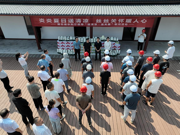 2024年8月16日,湖北省水利厅副厅长潘颖、厅财务处处长艾福庆、厅工会四级调研员刘芳及吴岭管理局领导一行莅临吴岭灌区工程施工现场,开展“送清凉、送健康”慰问活动。慰问高温酷暑天气仍坚守岗位的一线职工,送去各类防暑降温物品。