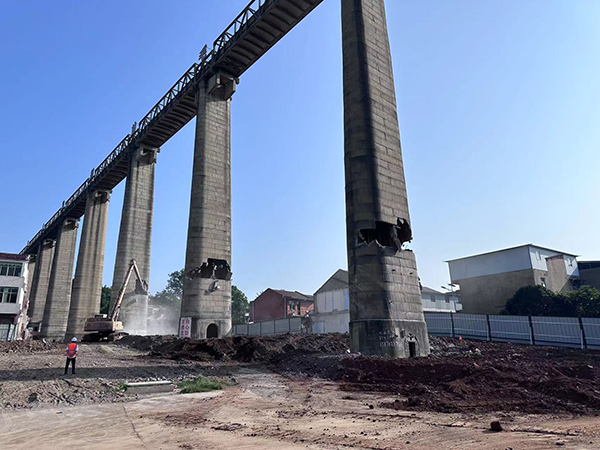 2024年8月22日,在孝昌县人民政府的协调下,水利局、应急局、公安局、教育局、周巷镇等多部门联合参与对青山渡槽拆除施工区域进行封闭警戒,禁止人员和车辆进入施工区域,保证人民群众的生命和财产安全。上午六时整,四台挖掘机挥动长臂,伴随着阵阵轰鸣声,依次对16#到3#空心墩1/3切口处和进出口排架进行破除,然后以3#墩柱墩帽为受力点,两台320c液压破碎锤同时向下游推动,最后渡槽整体结构于上午十时左右连锁倒塌,提前完成青山渡槽拆除任务。