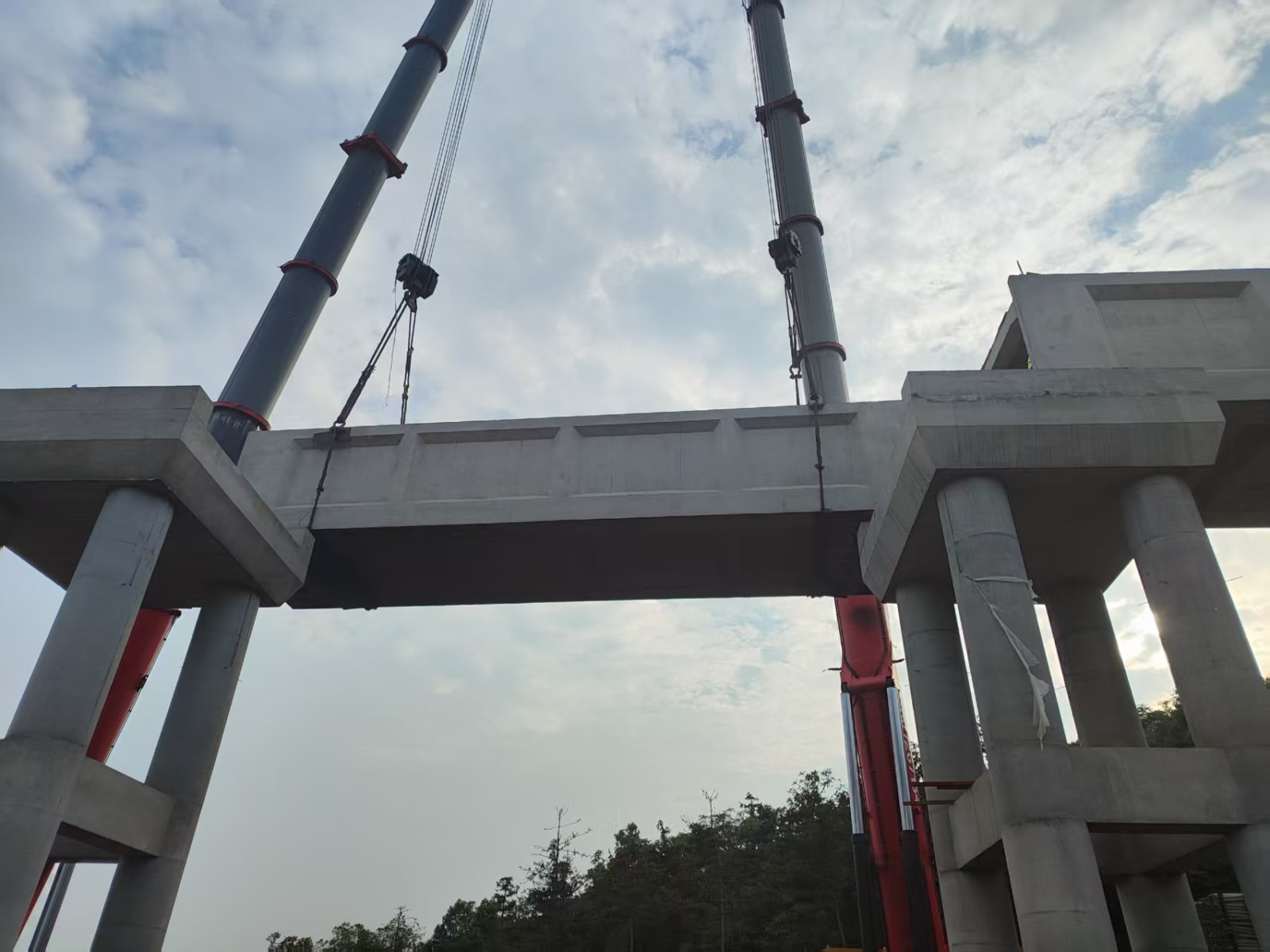 上午10时整,两台挖机准时抵达现场,对4#预制槽身的吊车站位区域进行了精心修整,确保站位平整、稳固,满足吊装作业的各项要求。下午5时左右,随着两台三一sac700t吊车缓缓就位于渡槽流水方向的右便道作业平台,一场精密而有序的吊装作业正式拉开序幕。吊装过程中,操作人员先将预制槽身缓缓吊起至离地20cm~30cm的高度,进行短暂的试吊检查,确认一切正常后,两台吊车协同作业,以平稳而匀速的方式将槽身缓缓提升。最终,在下午6时左右,4#预制槽身准确无误地落入渡槽轴线位置,吊装任务取得圆满成功。