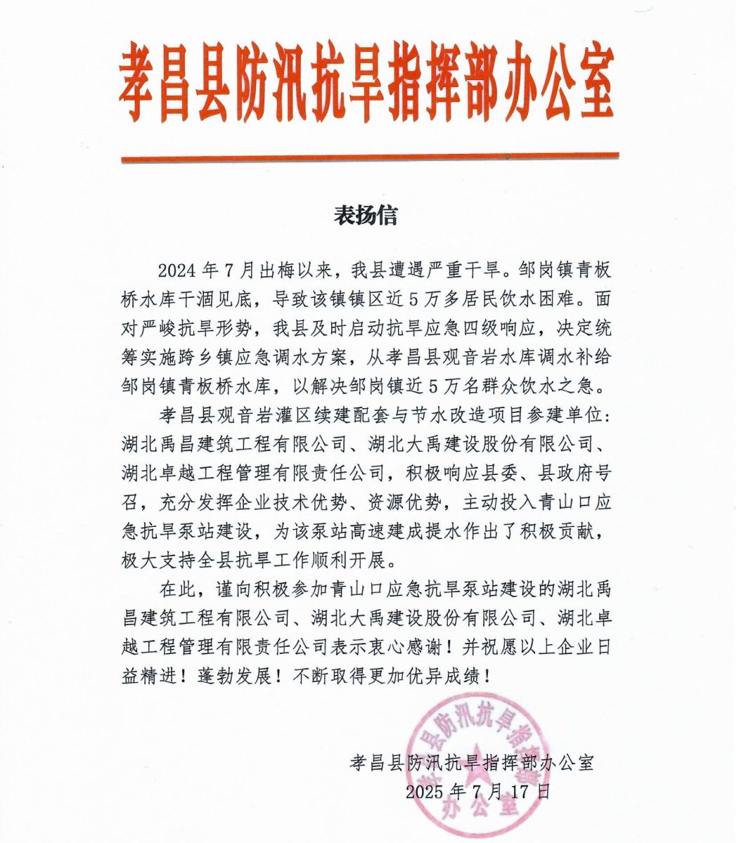7月17日,孝昌县防汛抗旱指挥部发布表扬信,对大禹公司积极响应县委、县政府的号召,发挥企业优势,主动投入到青山口应急抗旱站建设工作给予高度评价与充分肯定。