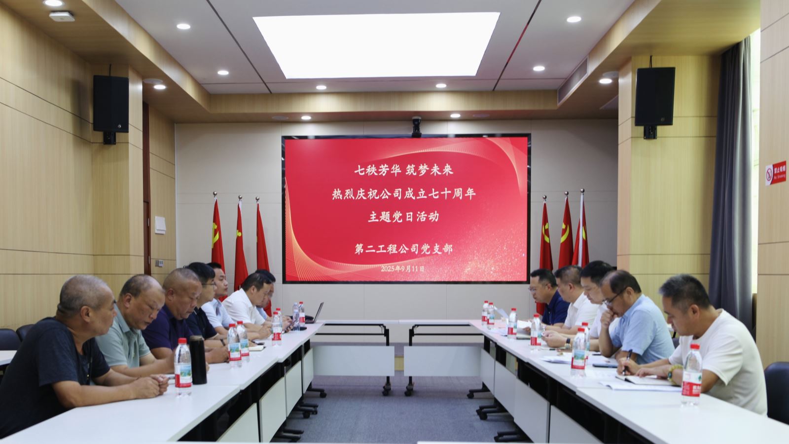 9月11日,第二工程公司党支部按照公司党委统一部署,组织开展“七秩芳华  筑梦未来——热烈庆祝公司成立七十周年”主题党日活动。公司董事、副总经理朱本和出席活动,与全体党员、入党积极分子、班子成员及骨干员工齐聚一堂,共忆峥嵘岁月,共话发展蓝图。公司党委副书记闵国武、党群工作部负责人到场指导并作专题宣贯,为活动注入了思想动力与组织引领。